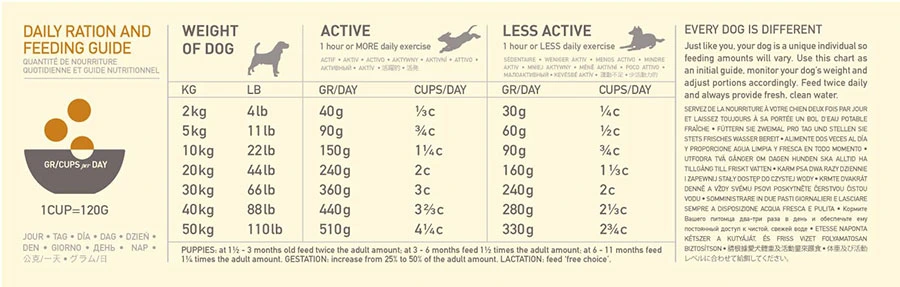 ACANA Wild Prairie barības izstrādātāji ir smēlušies iedvesmu mūsu plašajās, auglīgajās prērijās, dāsnajā augsnē un tīrajos ezeros, tādēļ šī barība satur unikālas vietējā reģionā audzētas sastāvdaļas, kas piegādātas svaigas no Rietumkanādas lauku saimniecībām un ūdeņiem. ACANA Wild Prairie barība ir pārpilna ar dabīgām, vērtīgām uzturvielām, ko nodrošina brīvās turēšanas apstākļos audzētu vistu un tītaru gaļa, dabiskā vidē dētas olas un savvaļā zvejotas zivis, kas ik dienas piegādātas svaigas WholePrey proporcijās. ACANA nodrošina olbaltumvielām bagātu barību ar ierobežotu ogļhidrātu saturu, kas iemantojusi uzticību visā pasaulē un uzlabo visu šķirņu suņu vispārējo veselību visos to dzīves posmos. Iepazīstieties ar sastāvdaļām – mēs domājam, ka jūs mums piekritīsiet. Svaiga vistas gaļa (8%), svaiga tītara gaļa (8%), svaigas vistu ķidas (aknas, sirdis, nieres) (8%), vistu milti (8%), tītaru milti (8%), veselu siļķu milti (8%), veseli zaļie zirņi, veselas sarkanās lēcas, veseli aunazirņi, svaigas veselas olas (4%), svaigs savvaļā zvejots zandarts (4%), svaigas savvaļā zvejotas foreles, vistu tauki (4%), svaigas tītaru ķidas (aknas, sirdis, nieres) (3%), pilngraudu lēcas, veselas pinto pupiņas, veseli dzeltenie zirņi, saulē kaltēta lucerna, polloku eļļa (2%), lēcu šķiedras, kaltēti vistu skrimšļi (1%), kaltētas brūnaļģes, svaigi ķirbji, svaigi sviesta ķirbji, svaigi pastinaki, svaigi zaļie kacenkāposti, svaigi spināti, svaigi sinepju laksti, svaigu rāceņu laksti, svaigi burkāni, svaigi „Red Delicious“ šķirnes āboli, svaigi „Bartlett“ šķirnes bumbieri, ar sublimācijas metodi žāvētas aknas (vistu un tītaru) (0,1%), sāls , svaigas dzērvenes, svaigas mellenes, cigoriņa sakne, kurkumas sakne, piena dzelksnis, diždadža sakne, lavanda, ārstniecības altejas sakne, mežrožu augļi.