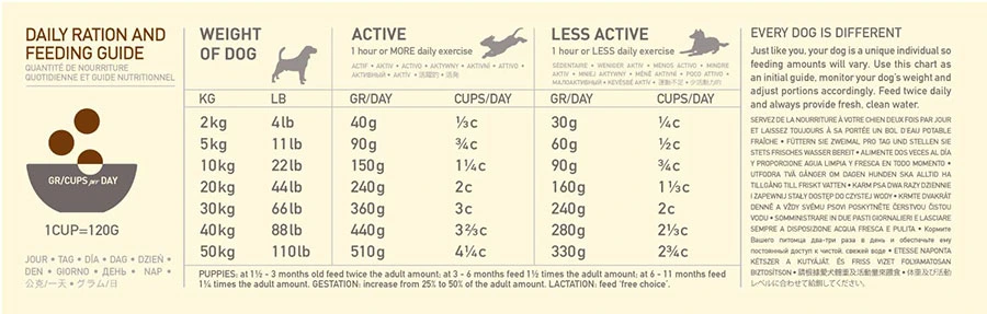 ACANA Ranchlands barības izstrādātāji ir smēlušies iedvesmu Albertas plašajās un auglīgajās lauku saimniecībās, tādēļ tā satur unikālas svaigas vietējā reģiona izcelsmes sastāvdaļas, tostarp lauku saimniecībās audzētu mājlopu gaļu un Rietumkanādas piekrastes ūdeņos zvejotas zivis. ACANA Ranchlands barība ir bagāta ar ‘Angus’ šķirnes liellopu gaļu, ar zāli barotu jēru gaļu, Jorkšīras cūku gaļu un līdzenumu bizonu gaļu un veseliem savvaļā zvejotiem zandartiem, tādēļ tā ir pārpilna ar barības vielām un ir ļoti garšīga. ACANA nodrošina olbaltumvielām bagātu barību ar ierobežotu ogļhidrātu saturu, kas iemantojusi uzticību visā pasaulē un uzlabo visu šķirņu suņu vispārējo veselību visos to dzīves posmos. Iepazīstieties ar sastāvdaļām – mēs domājam, ka jūs mums piekritīsiet. Svaiga „Angus“ šķirnes liellopu gaļa (8%), neapstrādāta ar zāli barota jēra gaļa (7%), svaiga Jorkšīras šķirnes cūku gaļa (7%), liellopu gaļa milti (7%), jēra gaļas milti (7%), cūkgaļas milti (7%), veseli zaļie zirņi, veselas sarkanās lēcas, veseli aunazirņi, liellopu tauki (5%), svaigas liellopu aknas (4%), svaigas cūku aknas (4%), svaiga bizoņu gaļa (4%), svaigs savvaļā zvejots zandarts (4%), veselas zaļās lēcas, veselas pinto pupiņas, veseli dzeltenie zirņi, saulē kaltēta lucerna, svaigas liellopu aknas (2%), polloku eļļa (2%), lēcu šķiedras, kaltēti liellopu skrimšļi (1%), neapstrādātas jēra spēķes (1%), kaltētas brūnaļģes, svaigi ķirbji, svaigi sviesta ķirbji, svaigi pastinaki, svaigi zaļie kacenkāposti, svaigi spināti, svaigi sinepju laksti, svaigu rāceņu laksti, svaigi burkāni, svaigi „Red Delicious“ šķirnes āboli, svaigi „Bartlett“ šķirnes bumbieri, ar sublimācijas metodi žāvētas aknas, (liellopu, jēru, cūku) (0,1%), svaigas dzērvenes, svaigas mellenes, cigoriņa sakne, kurkumas sakne, piena dzelksnis, diždadža sakne, lavanda, ārstniecības altejas sakne, mežrožu augļi.